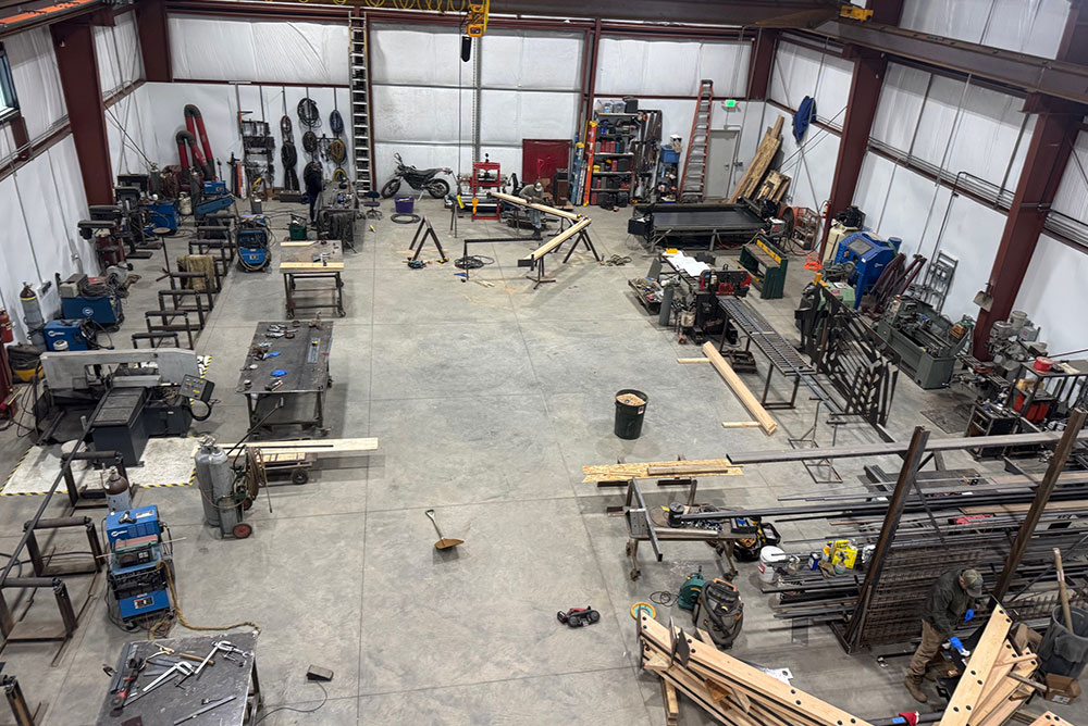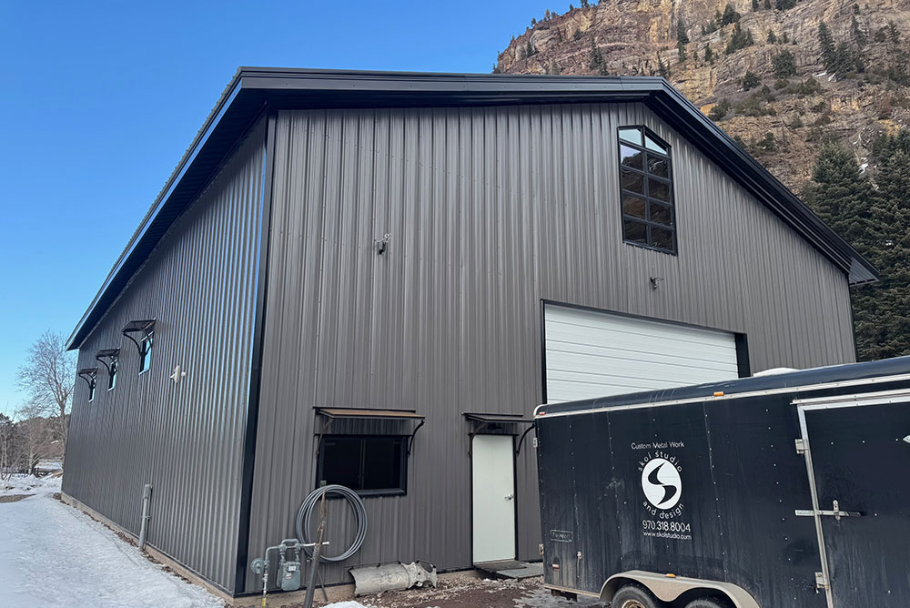 Sent by Sunward Steel to the scenic mountain community of Ouray, Colorado, in September 2023, this pre-engineered metal building functions as a fabrication shop for SKOL Studio & Design, Inc., an acclaimed designer and builder of architectural metalwork and furniture.